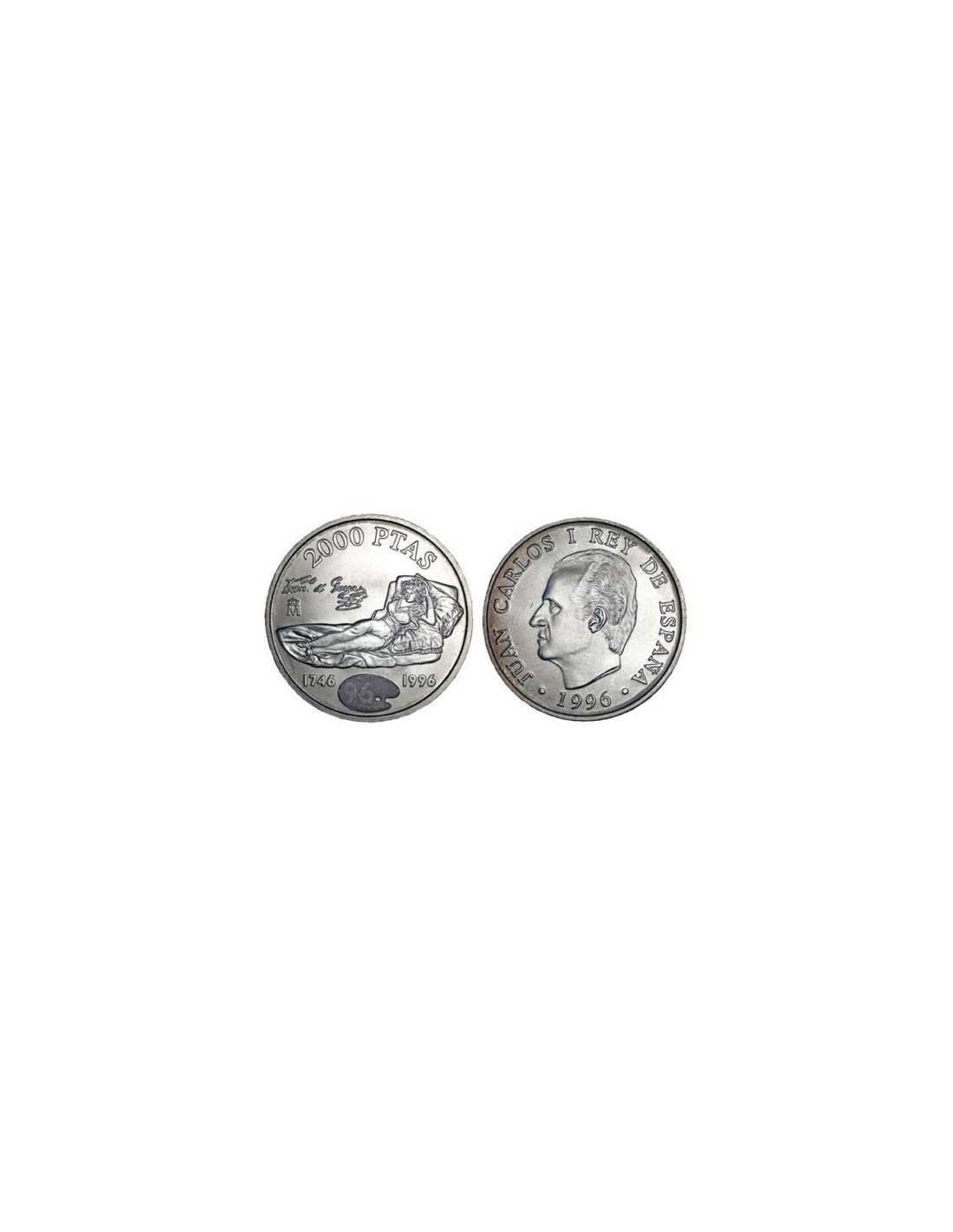 Moneda conmemorativa 2000 ptas. 1996. Plata. 250º Aniversario de Goya. La maja vestida. Peso: 18.2gr. Diámetro: 33mm.