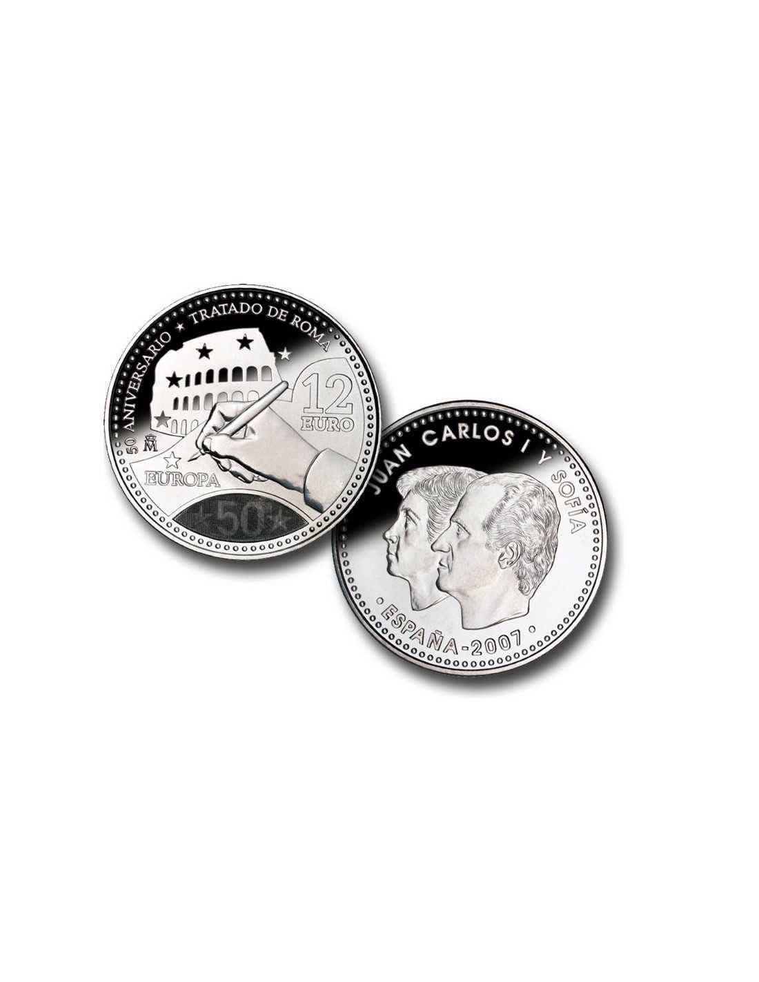 Esta moneda reproduce en el reverso la imagen de una mano en actitud de firmar y, al fondo, una silueta del Coliseo de Roma, emblemático edificio de la ciudad donde tuvo lugar la firma del Tratado.